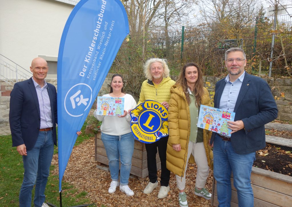 Im Beisein von Wieslochs Oberbürgermeister Dirk Elkemann konnten Wieslochs Lions Club-Präsident Thomas Stegemann und Lions Adventskalender-Initiator Uwe A. Dörner der Geschäftsführerin des Kinderschutzbund Wiesloch gGmbH Bianca Marinkas sowie Vorstandsmitglied Tina Hahner einhundert Lions Adventskalender überreichen.